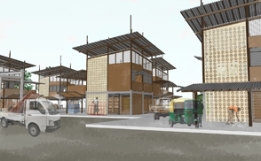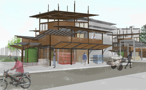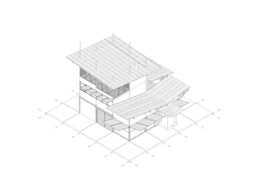 The semi-temporary construction module The workshops and the additional constructions of the Mercado de Reciclagem are based on the semi-temporary construction module. It applies low-tech and locally applied construction materials and techniques so that the unskilled Grande Hotel inhabitants are able to build, adjust, replace and rebuild the various constructions. The module gives the Grande Hotel inhabitants self-control allowing them to arrange their living environment to meet their owns needs and desires, not only at a single point in time but also in future perspective. The ‘bottom-up’ approach of the design is inspired by the ideology of ‘Open Building’ of John Habraken. The semi-temporary module system is based on a grid of 3.50 by 3.50 metres, which can be fit-in into the existing floor plans of the Grande Hotel building. The workshops consist of a constructive base frame of prefabricated concrete elements that are connected with reinforced in-situ concrete. This makes it resistant to cyclones that are rare in Beira. Each workshop can be extended by means of wooden frame elements construction to a floor plan that suits to the specific needs of the workshop. The dwelling on top of the concrete main frame is also made of a wood frame but it is more restricted to basic rules to sustain a proper internal climate. Each dwelling has an up-wind wedge roof which needs to be orientated in the average dominant north-eastern wind direction. This secures the exhaust of hot air and fire smoke and the supply of fresh air though under-pressure. The secondary outer roof provides insolation. The roof structure does not gives convection warmth to the interior though the 1.80 metres open air buffer between both roofs. The overhang of the secondary roof prevents direct sunlight falling on the inner-roof. Another beneficial property of this particular roof shape is the rainwater collection. The lowest point of the roof is drained to a water tank. Each workshop has a private water-tank with a minimum capacity of 5,000 litres. The capacity will be sufficient for a household of five persons to be able to rely only on the rainwater collection throughout the year. The shape of the roof forces the owner to situate the water-tank on the shaded southern side of the workshop. The internal organisation of the dwelling is based on the outcomes of the research concerning the daily use of the current Grande Hotel inhabitants (see The Daily Use paragraphs on the Research page of the site). The first floor is a large living space which could be adapted to a range of household activities. The central sitting area is situated around a concrete fire place. The smoke exhaust is via the natural ventilation and under pressure. The smoke is used to prevent malaria mosquito’s entering the dwelling. The sleeping area is situated on the second floor. The none-separation of the sleeping place from the living place is a major principle that clashes with the architecture of the hotel room-dwelling in de Grande Hotel and its current habitation (see The Daily Use paragraphs on the Research page of the site). The height difference separates the sleeping area from the living area in the workshop, although it benefits from the smoke exhaust as malaria prevention. The flexibility of the module is also represented in the façades. The façade of each workshop could be composed of various types of different façade elements. Because of the fixed dimensions of the constructive elements can be every façade element placed at every side. In the elaborated design, it is suggested that the stabilisation walls should be made of decorative cement blocks. The closed walls have a plastered surface and are filled with none-biodegradable garbage that creates a lightweight wall that is cheap because of the local material use and it does not absorb as much warmth as conventional walls used for local shelter constructions. On the ground floor are the open able façades made of grates of wood and a steel frame. The grates are open able by the bascule technique of a balanced self-weight. When the grates are opened, they will reduce the barrier between the internal and external working area to a minimum. This will generate direct contact between the public street and the working area, which will also lead to better mutual social integration.