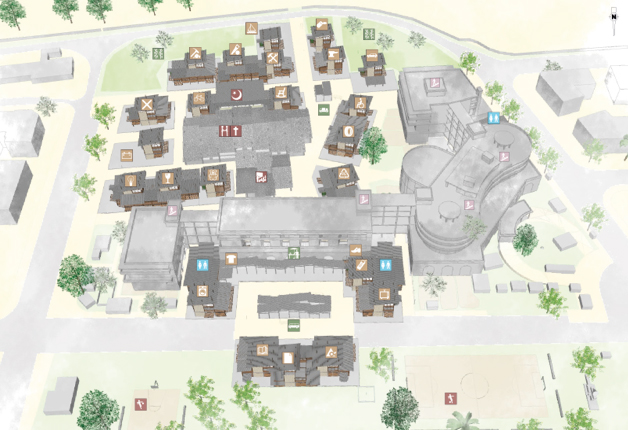 Besides the creation of an economic platform, there is also a need for to implement social and hygienic improvements to the exterior of the Grande Hotel. The existing church and mosque are centrally placed in the master plan. The church is relocated above the existing swimming pool. The polluted water is covered by garbage and concrete. The remaining pit is transformed into a stage and is covered by a roofing structure, which makes it a central gathering place like the ‘oupale’ in the kraal concept (see the Social Conditions paragraphs on the Research page of the site). The central gathering place could be used for small or large community meetings, church services, but also for markets. The mosque, however, is not moveable for religious reasons. The existing mosque building is integrated into the new context by adding a new floor for a prayer room for women and a veranda to express the communal character of the building. In the removed section of block B of the existing Grande Hotel building is transformed into a permanent market hall. Here entrepreneurs can establish their businesses to sell food, drinks, household goods, airtime and other goods which could be attractive to sell to the consumers and Grande Hotel inhabitants. To provide a proper alternative to the swimming pool as well as to solve other hygienic problems, there are three latrine units implemented (the blue icons in Fig. 6). The units are situated between each block of the existing Grande Hotel building and are directly connected to each floor. The latrine unites facilitates: sanitation, bathing, water taps, laundry places and garbage collection. It also serves to protect the semi-entrances of the Grande Hotel building to the public area of the Mercado de Reciclagem and generates a communal gathering place for the Grande Hotel community itself. All these constructions are based on the semi-temporary construction module.