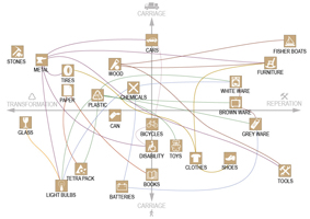 The concept of Mercado de Reciclagem The design goal is to recycle – architectural modification, intervention, transformation – the foreign modern architectural building which has been transformed into a vertical slum and to turn it into a more permanent type of residence for the present community with new socioeconomic development opportunities in the Mozambican neoliberal context. The focus of the design is based on the idea of generating a durable socioeconomic platform on the plot of the Grande Hotel and not directly on improving the living conditions of the individual dwellings in the Grande Hotel building. In the long-term perspective the increased wealth will lead to improve the living conditions in these individual dwellings. As mentioned above, are the Grande Hotel inhabitants are forced to compete in the existing fixed informal economy to gain a miserable income. The ‘Mercado de Reciclagem’ – the recycling market – is a concept that opens up new business opportunities whereby the Grande Hotel inhabitants are able to complement the existing local informal economy to gain a durable and sufficient income. At the Mercado de Reciclagem the Beirians can sell their waste products in a wide range of different workshops. Each workshop is specialized in the transforming or repairing of specific types of goods. The final product will be sold by the workshop holders to gain a profit. This socioeconomic concept opens up great possibilities for the Grande Hotel inhabitants to have a sustained livelihood prosperity that will release them from poverty. The city of Beira will also benefit. Besides providing new business opportunities for the existing economy, it will also make a contribution to the environment. The municipal dumpsite would be less attractive to use for the economical benefit of the Mercado de Reciclagem. They can now earn money with waste. The political interests will be that it generates a positive image by how inhabitants of the city are able to develop and pull themselves out of poverty together in a positive (socio)economic and environmental perspective. The positive drive could be beneficial to the image of the city as a prosperous business climate to attract new companies. The benefit of the Ponta Gêa neighbourhood is that it improves liveability because of all the new activities. The economic activities will contribute to the social integration of the Grande Hotel inhabitants in the urban society of Beira. The new economic complementation will change the negative excluding image of ‘whato mundo’ towards new social networks that integrate the Grande Hotel into the urban society. A civil amenity site – also known as a ‘household waste-recycling centre’ – is a comparative example that explains the organization of the Mercado de Reciclagem. A civil amenity site is a facility in every municipality of the European Union to which you can take bulk waste. The average civic amenity site consists of a large platform you can drive on top of and in order to distribute and sort the waste into different containers that stand next to the platform (Fig. 1). In the context of the Mercado de Reciclagem each container will be a different workshop which is specialized in the recycling of a specific group of materials or products. Each workshop is owned by a different entrepreneur and will pay each consumer who offers waste, recycles it and resells the final products. During the recycling process a workshop could also obtain other materials linked to its specialization, which would lead to an internal stream of materials between the workshops (Fig. 2). The diagram of the internal organization also considers the incoming and outgoing streams as well as the average suspected size and quantity of how the specific materials will be transported, in order: by foot or by car.