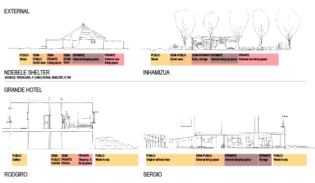 The Daily use The architecture of the Grande Hotel forces the inhabitants to re-arrange their rituals of daily use. In some cases it happens successfully, but not for most rituals. The general distribution of functions in a dwelling is visualised in the sections with privacy gradient (Fig. 1). In comparison with a native and current example is the transition of a dwelling in the Grande Hotel blurred Hotel. Paito is forced to cook in public space by the fixed division of space of his hotel room. The self-made ‘in-built’ shelters in the Grande Hotel have a similar organization to the native example and distinguished them of the original spatial organization of the Grande Hotel. Another example of misuse is that Paito is forced to share his semi-private living space with the intimate sleeping space, while this is normally strong separated in Mozambique. It is interesting how the current culture of daily living adapted the original structure of the Grande Hotel, which is designed for the original proposed luxurious Western holiday lifestyle. Southern African societies have a strong ability to adapt rituals of foreign cultures in their daily lives. This is only possible when the mutation does not compete with their existing rituals. This happened in the situation of the Grande Hotel. The design of adjustment should take a step back in the ‘civilization’ towards Western living standard and respect the value of the existing African standard in general.